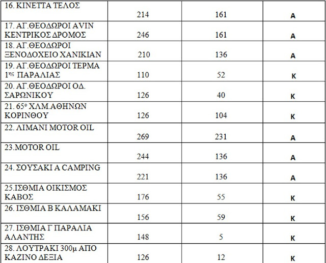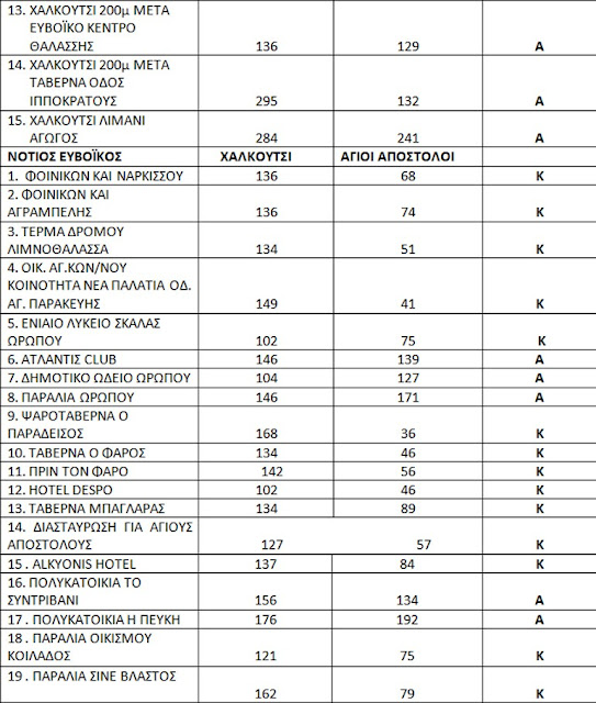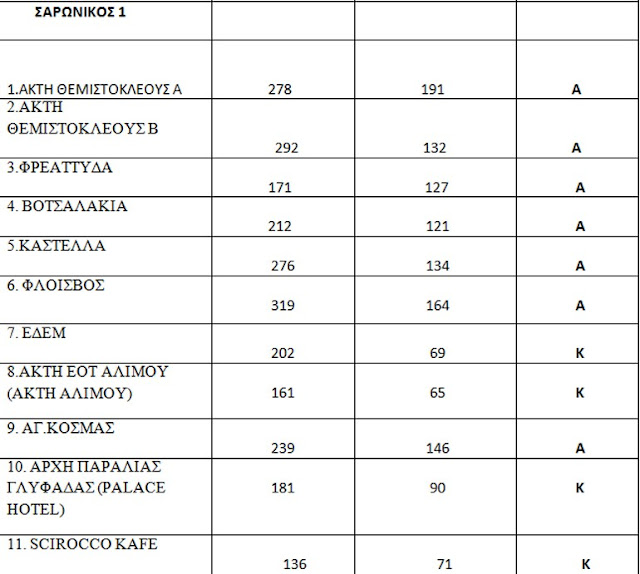 Στους παρακάτω πίνακες, που αφορούν στις ακτές της Αττικής, του Ευβοϊκού και του Κορινθιακού, δεν φαίνεται απλώς η καταλληλότητα ή μη της κάθε ακτής, αλλά και ο βαθμός της όποιας καθαρότητας, καθώς παρατίθενται αναλυτικά και οι τιμές για τα κολοβακτηρίδια και τον εντερόκοκκο ανά όγκο νερού.